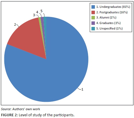 The questionnaire was distributed in such a way so as to get students from different levels of study at the University of Mauritius. Figure 2 shows the demographics of participants including undergraduates (81.1%), postgraduates (16.4%), alumni (0.01%), graduates (0.01%) and unspecified (0.01%). Thus, the overwhelming majority of students were undergraduates while a few who responded to the invitations were no longer students of the university. Out of the 122 respondents, 54 (44.3%) participants were male students and 68 (55.7%) were female students.