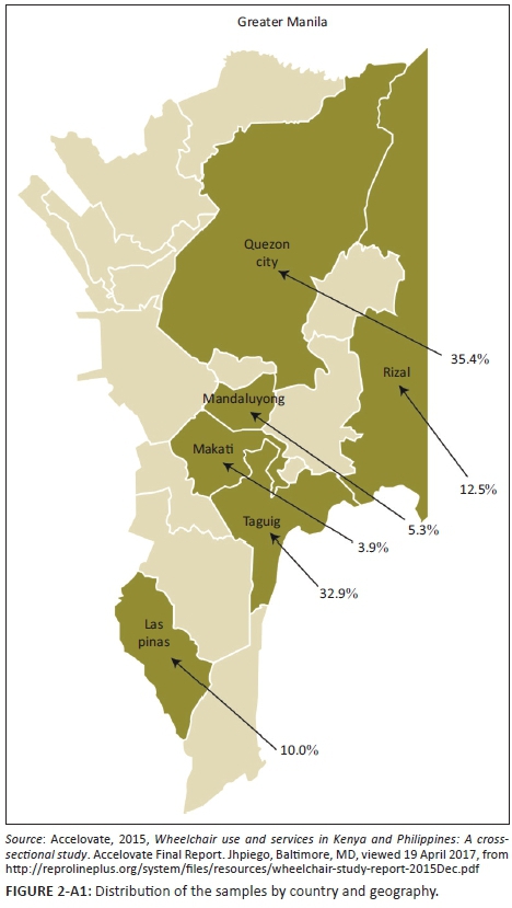 The authors would like to thank Jhpiego staff Deepti Tanuku, Accelovate Director, and staff in Kenya and the Philippines, including Dr Bernabe Marinduque. The authors are grateful to the Institute for Health Policy and Development Studies, University of Philippines Manila, for leading the Philippines data collection and to the surveyors in both countries. This research would not have been possible without the many devoted representatives of organisations in Kenya and of local government units and barangays in the Philippines who helped the authors reach the wheelchair users. Finally, the authors express their gratitude to the more than 800 wheelchair users who were participants in this study, as well as the caregivers who supported their participation. The authors thank Mr Peter Mbuguah for advice on study location and comments on the article.