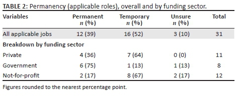 Overall, less than half (18 of 44 jobs, 41%) of all jobs were reported as fulltime. Participants were asked to identify if roles they held were permanent or temporary or to identify if the type of role made this irrelevant (i.e. independent volunteering or self-owned private practice). Overall, of the 44 jobs, 27% (n = 12) fell into the not relevant category. The permanency of applicable jobs, by funding sector, is reported in Table 2.
