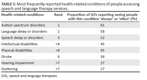 The most frequently reported health-related conditions of people seeking SLT services were speech or language delay or disorders, autism spectrum disorder, physical disabilities and intellectual disabilities. The data indicated that many of the SLTs sampled work across a range of areas in a generalist approach, in contrast to countries of the Minority World, where services and systems are well developed and therapists often work in specialised or specific areas of practice.