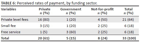 Respondents were asked to indicate if direct payment was required for clients to receive SLT services or if services were free at the point of use. Respondents indicated that almost two-thirds (64%) of clients directly paid for SLT services at a level perceived by the therapist to be commensurate with private or commercial rates. The remainder were noted to pay either a small or subsidised fee (18%) or to receive a service free at point of use (18%). Payment levels, by funding sector, are outlined in Table 6.