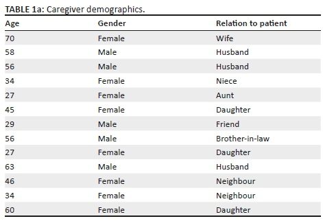 The study sample consisted of 13 participants with a mean age of 47 years for the caregivers and 59 years for the patients. The majority of the caregivers were female and in most instances the spouse of the patient (Table 1).
