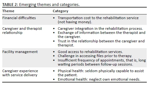 All taped interviews were transcribed verbatim. The transcripts were then compared to the voice recordings to verify accuracy. The Afrikaans transcripts were translated into English after the recordings were verified. Transcriptions were translated from English and back to the interviewees' language to ensure validity. Data were analysed using a coding process to sort the information according to categories within the predetermined themes. Data analysis was performed using the following predetermined themes: financial difficulties, caregiver and therapist relationship, facility management and caregiver experience with service delivery. Within the predetermined themes, categories were identified by the first author and consensus was reached through discussion with the second author. All categories were supported with quotes from the interviews.