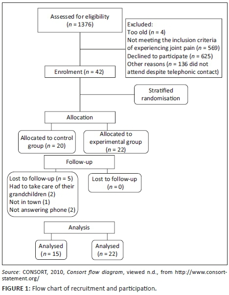 Participants who had screened positive for MSC a month earlier during the epidemiological survey, who had indicated their willingness and commitment to take part in the intervention, were contacted telephonically to invite them to enrol in the 6-week intervention programme. The researcher (first author) allocated participants to groups as they were recruited into the study. The research assistants who were responsible for administering the outcome measures were blinded as to the allocation. The research assistants were trained by the researcher to ensure that the tests were performed according to the procedures as described in the literature. The experimental group received a date and time for screening and a physical examination by a qualified medical practitioner to assess for risk factors, but no one was excluded on this basis. Once all participants had been cleared for participation, they received a calendar indicating the time and dates for the intervention.