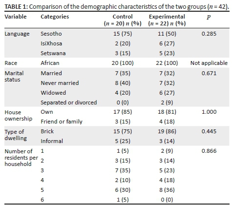 At the start of the first session of the intervention, participants were given information to explain why exercise is important, and how to effectively make use of the workbook during the structured education classes as well as at home. The aim of the workbook was to facilitate the development of self-management, decision-making skills, problem-solving skills, and obtaining and utilising resources to assist with managing the chronic disease (Lorig & Holman 2003). The workbook included sections on goal setting, problem-solving tasks and exercise diaries to facilitate skills acquisition. While the control group went about their daily lives as usual, the experimental group attended a weekly educational programme, discussion group and an exercise class lasting 2 h, for 6 weeks at the community hall. In the adapted and developed workbook 'Balanced lifestyle', educational topics were specific to the population identified in the survey, which included middle-aged women living with hypertension, diabetes mellitus type II, obesity and MSC. The educational programme aimed at providing information on what each chronic condition was, type and method of exercise deemed appropriate to perform at home, management of common symptoms of MSC, stress management and, finally, healthy food options, including portion sizes according to food-based dietary guidelines with a focus on weight loss. The last educational session included an action plan to continue as a successful self-manager.