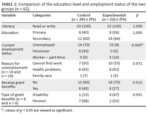 The mean age of the participants was 54.5 (SD = 6.8 year, range 40-64 years), and there was no significant difference in age between the two groups. As can be seen in Tables 1 and 2, there were no significant differences in demographic profiles of the groups apart from the larger percentage of unemployed participants and fewer being on pension in the experimental group.