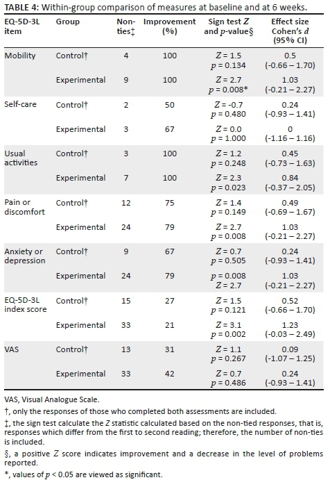 Data were collected in hard copy and then captured by the first author on an Excel spreadsheet and a second person verified the captured data by capturing the data on a separate Excel spreadsheet to ensure accuracy before statistical analyses. Analysis was performed jointly by a statistician, the researcher and one of the supervisors, who, by the nature of the data, were aware of group membership. The York tariff was used to calculate the Index Score (Dolan 1997). The self-efficacy scores were summed and presented out of a maximum of 60 points. The results of those in the control group who did not attend for the second assessment at 6 weeks were excluded from analysis. Descriptive statistics were used to describe the demographic characteristics of the participants. Between-group design requires between four and eight times more subjects than a within group design to reach statistical power (Bellemare, Bissonnette & Kröger 2014). As the study was underpowered and there were discrepancies at baseline in some variables, within-group and between-group analysis was performed throughout. In variables in which the baseline scores differed significantly, the t-test or sign test was used to compare the means of the differences over time. The paired t-test was used for normally distributed, numeric data and the Wilcoxon signed rank or sign test for the ordinal, non-normal data. Statistica (version 7) (StatSoft, Tulsa, Oklahoma, USA) was used for data analysis. Cohen's d was calculated to determine the effect size, either using the Z statistic yielded by the Mann-Whitney U or sign tests or the t statistic from the t-test results using the Lenhart and Lenhard (2016) online calculator. The 95% confidence intervals (CIs) of d were calculated using the formula proposed by Lee (2016).