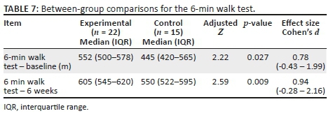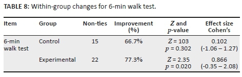 The 6-min walk test results are numerical, but as they were not normally distributed (Shapiro-Wilk p < 0.05) non-parametric tests were used (Table 7 and Table 8). The experimental group performed significantly better at 6 weeks on the 6-min walk test (p = 0.009) than the control group. As the 6-min walk item was significantly different between groups, or approached significance at baseline, the change in score within groups was also calculated. The within-group change from baseline to 6 weeks was only significant in the experimental group (p = 0.020).