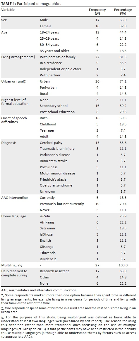 Participants had to (1) be 18 years or older, (2) have a level of autonomy in expression that ensured that their thoughts and opinions could be captured in an unbiased way and (3) use a form of AAC because of having complex communication needs. Participants were recruited via an empowerment programme for young adults using AAC, and also via an email list of persons interested in AAC. This empowerment programme for young adults using AAC is run annually at a university-based institution. Participants take part in communication and empowerment training activities for the duration of 1 week. Participants were approached in person during programme weeks, and alumni were approached via email or text message. A total of 24 persons were approached, and 21 gave consent to participate. As these participants were all known to the researchers in person, the researchers were able to verify that the participants met all the selection criteria. A further seven persons responded to an invitation sent to a South African email list for persons interested in AAC (including persons who use AAC, family members and service providers) administrated by a university-based institution. This list contains 1138 email addresses; however, because many email addresses may not belong to multilingual South African adults who use AAC, it is not possible to report a response rate. To ensure that participants met the selection criteria, they were asked to confirm this by answering three questions related to the three criteria. Of the seven respondents, one indicated that he did not require AAC because his speech was functional, and this respondent was therefore excluded from the study. Of the remaining six respondents to the emailed invitation, only one was not directly or indirectly (via service providers) known to the researchers. However, the respondent contacted the researchers via email after completing the study, and through the emailed exchanges seems very likely that he met the selection criteria. Therefore, the researchers are confident that all respondents met the selection criteria.