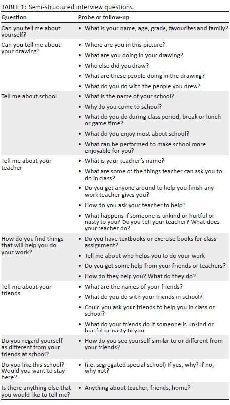Including children with disabilities as active participants in research on inclusion can provide stakeholders with a unique view of opportunities and challenges and inform targeted practices to support inclusion in the future (Coates & Vickerman 2010). Furthermore, as noted by Rose and Shevlin (2004:160), paying attention to children's views 'enable[s] us to reflect upon how future developments may afford greater opportunities to those who have been previously denied'. To that end, we sought to engage children with IDD to learn about their experiences in inclusive schools. Specifically, we collected and analysed the data to answer the following question: what are the experiences of children with IDD in inclusive schools in Accra, Ghana?
