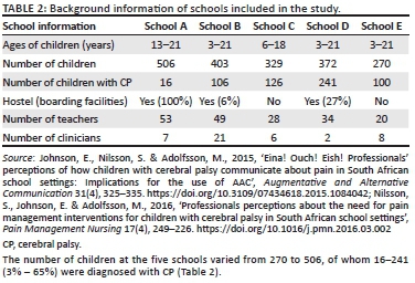 Principals from five public schools for children with special educational needs which accommodate children with CP in the Gauteng area of South Africa gave permission for focus groups to be conducted with staff at their schools in February 2014. The school principals (or a designated person appointed by the principal) completed a short questionnaire to provide the investigators with detailed information on the school, for example, the ages of the children accommodated in the school, the number of children in the school, the number of children with CP in the school as well as whether the school has a hostel facility (see Table 2). The participating schools accommodated children with various types of disabilities, including CP. Three of the five schools were boarding schools where children from rural areas were accommodated in hostels. As the children from rural areas had to attend a boarding school, they typically start schooling at the age of seven. It was reported by some of the participants that these children received limited to no early intervention (EI) services, resulting in hip displacement or dislocations and chronic nociceptive musculoskeletal pain already present.