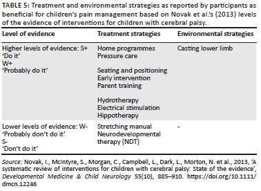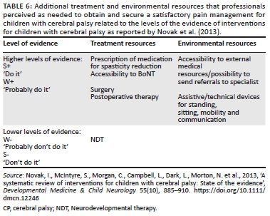 From Table 1, it is clear that interventions such as neurodevelopmental therapy (NDT), casting or hip bracing to reduce spasticity do not have sufficient levels of evidence (W- and S-) to prove them to be beneficial interventions to treat pain in children with CP (Novak et al. 2013) as some healthcare professionals tend to believe (Nilsson et al. 2016). It is further important to mention that according to Novak et al.'s (2013) level of evidence, lower limb casting has S+ evidence for contracture management but W- for spasticity management - it is this kind of discrepancy that makes it difficult for healthcare professionals to discern treatment choices. Therefore, it is important for researchers and healthcare professionals to determine if the current intervention practices used are evidence based and could, in fact, support pain management in children with CP.