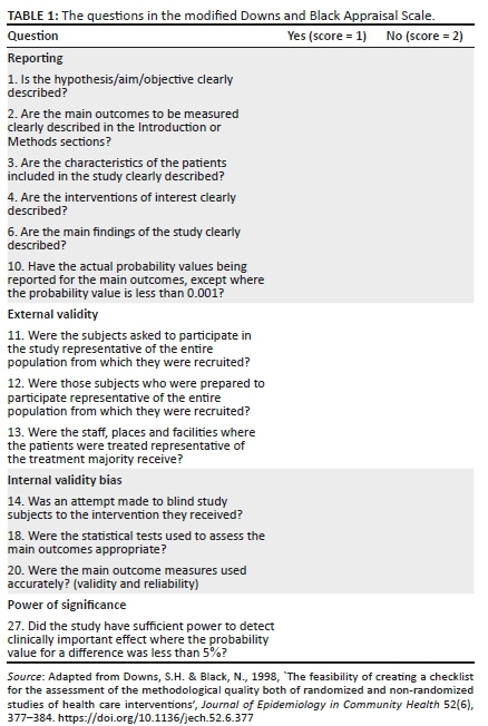 The value of each record was assessed by adopting a modified Downs and Black Appraisal Scale, which examines the merit of randomised controlled trials and non-randomised papers (Downs & Black 1998) (Table 1). A modified Downs and Black Appraisal Scale was applied as not all of the questions on the original checklist were related to this study, as underlined by Gorber et al. (2007). These practices were employed in order to avoid any researcher bias. The modified checklist comprises 13 questions, with a maximum of 13 points. A score of either 0 (no) or 1 (yes) was given for each answer. The questions adopted from the modified Downs and Black Appraisal Scale are 1, 2, 3, 4, 6, 10, 11, 12, 13, 14, 18, 20 and 27 (Table 1). These questions are classified into four sections, which evaluate the whole merit of each record (Table 1). The classification considered the reporting prowess (n = 6 questions), external validity (n = 3 questions), internal validity (n = 3 questions) and power of significance (n = 1 question) of each publication (Downs & Blacks 1998). The reporting sub-section reviews the studies' aims, sample characteristics and the outcome measures. The external validity reviews the representativeness of findings, and whether they can be generalised from the population the subjects were recruited from (Downs & Black 1998). The internal validity reviews whether subjects were blind to interventions used, and whether the statistical analyses were appropriate. The power of significance reviews whether the statistical tests used were adequate to determine clinically important findings (Downs & Black 1998). In the event of any disagreements amongst the authors (M.S., T.J.E. and H.V.H.) regarding the score of the selected records or articles, the authors were able to query the scoring of each record and would then discuss the scores adopting the jointly accepted score. The cumulative score of each record was subsequently converted into a percentage, thereby appraising the overall merit of the individual records (Downs & Black 1998). The overall merits of the records were further classified into the following scale: less than 50% (weak), 50% - 69% (fair), 70% - 79% (good) and less than 80% (very good) (Li, Khoo & Adnan 2017). The mean rating of the selected papers was 76.3% (good).