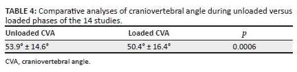 A total of 1061 participants were recorded across the 14 studies, with an average age of 11.5 years (± 1.3), which yielded an average of 13.75% backpack mass relative to the child's body mass. The average CVA was 53.9° ± 14.6°, whilst standing without carrying a backpack (unloaded phase) was reduced to 50.4° ± 16.4° when loaded (p < 0.05) (Table 4). Backpack loads carried by subjects varied from 5% to 30% of the participant's average body mass and produced a mean CVA decline of 3.5°. The participants' average body mass was 37.8 kilograms (kg) ± 6.6 kg, height was 1.41 metres (m) ± 0.05 m and backpack mass was 5.2 kg ± 0.9 kg.