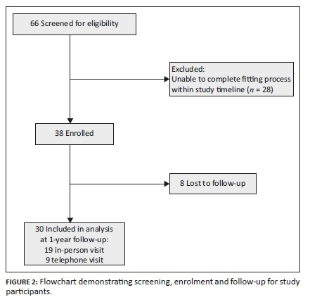 We screened a larger number of patients than were ultimately included in the study because of the inability of some patients to complete the fitting process within the study timeline. Even with the provision of a prosthesis at no cost to patients, challenges related to inconsistent availability of locally sourced materials, a limited number of trained providers and the need for patients to travel to the prosthetic workshop for multiple fitting visits contributed to the observed inefficiency of the fitting process in this resource-limited environment. Considering the sample size needed to power the study and the limited resources available to extend the timeline of the study, the number of patients ultimately included in the study was considered sufficient. Of note, regression analysis was not performed, so results should be interpreted with the understanding that there may be additional factors that contribute to observed improvements in QOL and function.