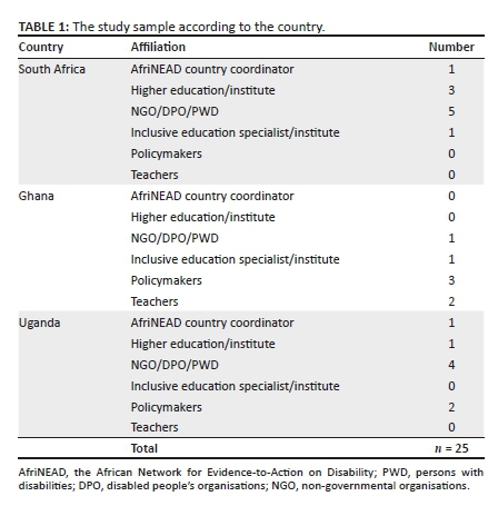 AfriNEAD is a flagship project of the Centre for Disability and Rehabilitation Studies at Stellenbosch University. AfriNEAD supports the much-needed translation of research into evidence-based advocacy, practice and policy, particularly in the pan-African context by facilitating dialogue across stakeholders through their network of disabled people's organisations (DPOs), non-governmental organisations (NGOs), and various community-based practitioners, policymakers and academics (Ohajunwa et al. 2017). With this reach, the AfriNEAD country coordinators were able to direct the researcher to DPOs, policymakers and other persons of interest who could give rich information regarding the study focus.