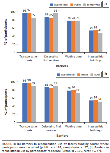 RESULTS: Two hundred and thirteen adults were recruited from nine facilities. There is a sixfold difference in the number of rehabilitation personnel between public and semiprivate hospitals in these facilities' catchment areas. However, most participants were recruited at public facilities (186 [87%]), primarily with physical disorders. Patients reported that family support (94%) was the most crucial facilitator for attending rehabilitation, whilst transportation cost (96%) was a significant barrier