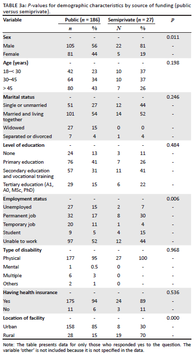 The data collectors participated in a three day training programme that included training on administration of the questionnaire, data collection procedures (recruitment, sampling) and ethical norms in research, particularly data collection. Each selected site had a site champion who was briefed on the type of participants needed for the study. Site champions randomly recruited all participants, and those who agreed to participate were referred to persons administering the survey. Eligible participants who were available during the three days of data collection, and agreed to participate, were recruited for the study. The data from the facilities and patients are presented by the source of funding (public or semiprivate) and geographical location (urban or rural). We were interested in assessing the differences between patients with disabilities who attended public and semiprivate facilities in urban and rural areas. Therefore, the data are presented in two sample proportions.