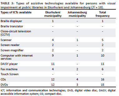 It is clear from Table 3 that CDs and DVDs were equally available in most libraries in CoE. Also available were daisy players and computers with internet services in the municipality, although in a limited capacity. Furthermore, fewer libraries had fax machines, scanners, screen readers, screen magnifiers and braille displayers as shown in Table 3. In CoJ, CD, DVDs, fax machines, computers with internet and scanners were available at few libraries as shown in Table 3. In Nigeria, Adetoro (2014) found that the availability of alternative formats was limited while electronic resources were unavailable.