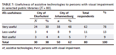 Librarians were further requested to indicate whether they considered ATs in public libraries to be 'very useful', 'less useful' or 'not useful' in fast-tracking service delivery to the PwVI. While all respondents answered this question, most respondents from both CoE and CoJ were of the view that ATs were 'very useful'. However, some believed that ATs were less useful while the least number of respondents from both cities were of the view that ATs were not useful as shown in Table 7.