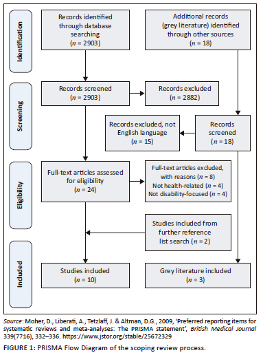 The results of the search and screening processes for both bodies of literature are presented in the PRISMA flow chart (see Figure 1). The first search produced 2903 peer reviewed articles and 18 country reports for screening. After titles and abstracts were screened, 2882 articles as well as 15 non-English language country reports were excluded. The full text of the remaining 24 articles was assessed, and 16 of these were excluded because of not being health-related or not having a disability focus. The reference lists of full text articles were searched for further eligible literature, and two (n = 2) articles were included from this search. Ten peer-reviewed articles and three country reports (grey literature) were, thus, included in this review.