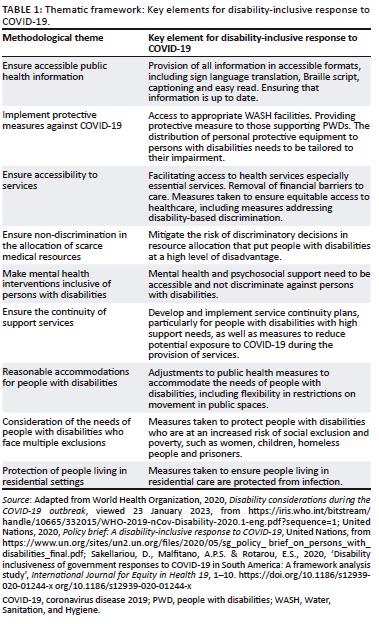 People with disability are often excluded from policy actions during emergency responses to crises situations (McKinney, McKinney & Swartz 2020; Ned et al. 2020; Toquero 2020). Prior to the coronavirus disease 2019 (COVID-19) pandemic, studies of disaster risk frameworks showed that people with disabilities are not explicitly considered in such frameworks, despite the adoption of the Sendai Framework Disaster Risk Reduction 2015-2030 that guides inclusive disaster risk responses (Bennett 2020). For example, a study of Indonesian disaster regulation laws found that people with disabilities were not mentioned in higher laws, and were often referred to as 'vulnerable groups' or mentioned with other vulnerable groups (Pertiwi, Llewellyn & Villeneuve 2020:3). With climate change, social instability, and new and emerging infectious diseases likely to cause more global health emergencies as observed during COVID-19, there is a need to continuously examine disaster responses to realise inclusion and rights of people with disabilities. Both the pandemic and its measures for containment, if not inclusive, pose threats to people with disabilities. Thus, more research is needed to explore the inclusiveness of health systems during the COVID-19 pandemic, more so in LMICs (low- and middle income countries) as 80% of the 16% global population with disabilities live in LMICs (World Health Organization [WHO] 2022).