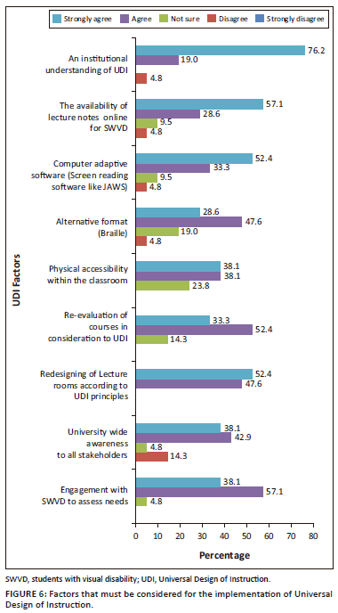 Several important factors emerged through the study's findings in conjunction with four highly ranked UDI principles (equitable use, flexibility in use, size and space for approach, and tolerance for error). Figure 6 showed how students rated important factors to be taken into consideration for the implementation of UDI at the university. Firstly, an institutional understanding of UDI was pertinent. Secondly, engagement with SWVDs to assess needs was significant to maximise learning outcomes and create a university-wide awareness that included all stakeholders. The majority were in favour of re-designing lecture rooms and re-evaluating courses in consideration of UDI principles, as the flexibility of a design such as UDI would enable SWVDs to participate in activities promoting interaction among students and instructors. In applying UDI principles, one needs to be cognisant of the diversity of human abilities and conditions and choose the most appropriate design within the context of the classroom (Heylighen 2014). In line with UDI, these factors offer a simplified design for easier access to teaching and learning methods and ensure an adequate and appropriate workspace for students who may require specific arrangements within the classroom. Hewett et al. (2018) expressed that the university needed to transform entrenched attitudes of traditional HE systems and evolve by embracing a new educational perspective such as UDI, which required a period of learning and knowledge acquisition by all stakeholders.