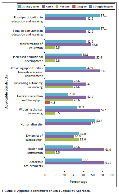 Based on the above statistical outcome, Sen's Capability Approach is a highly applicable model for the implementation of UDI. The majority of students agreed that the application of UDI in the classroom can maximise learning outcome for SWVDs and enable all stakeholders to work collaboratively in a system within the classroom, promoting shared responsibility through social interaction of SWVDs, lecturers, and other students and participation of SWVDs in all aspects of learning in the classroom. Enhanced capabilities make people autonomous and autonomy leads to possibilities to achieve well-being, quality of life, equity, and equal opportunities for all people (Schiemer 2017). Figure 7 reflected a high level of agreement by SWVDs that enhanced capabilities increased autonomy in learning. The Capability Approach focuses on ensuring equality and developing human potential. This is aligned with the principles of UDI to enhance the capabilities of SWVDs, thereby reducing the consequences of disability and increasing opportunities for SWVDs to satisfy their basic need for quality education (Broderick 2018; Dubois & Trani 2009).