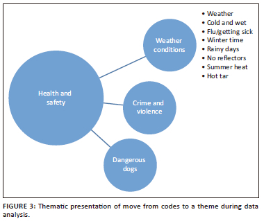 Data were transcribed verbatim and analysed using the six steps of Braun and Clarke's (2012) inductive thematic analysis approach. The first author coded the data manually, by reading the transcribed data line by line and assigning codes. Codes described what was seen in the data, and the data were organised into meaningful groups such as stairs in house, distances, weather, dogs, violence and disrespect. The codes and all supporting quotes were organised into provisional themes. Figure 3 shows the process followed from one group of codes to a category to a theme. This provisional analysis was shared with the second author who further developed the themes, and the two authors reached consensus on the final themes.
