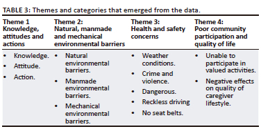 Four themes emerged for the data as shown in Table 3. Theme 1, 'Knowledge, attitudes, and actions' shows that minibus taxi drivers lack the knowledge and skills to transfer wheelchair users into and out of a minibus taxi. It also presents a lack of mutual respect between drivers, wheelchair users and fellow commuters. Theme 1 ends with describing how some minibus taxi drivers did provide transport to wheelchair users while others refused. Theme 2, 'Natural, manmade, and mechanical environmental barriers', shows that aspects related to the physical environment such as the hilly nature of the town, dirt roads, and the design of minibus taxis resulted in barriers. Theme 3, 'Health and safety concerns', illustrates how a seemingly everyday activity, like moving around in the community could be challenging, with a negative impact on health and wellbeing. Theme 4, 'Poor community participation and quality of life', shows how community mobility challenges prevented wheelchair users and some caregivers from participating in life roles in the community.