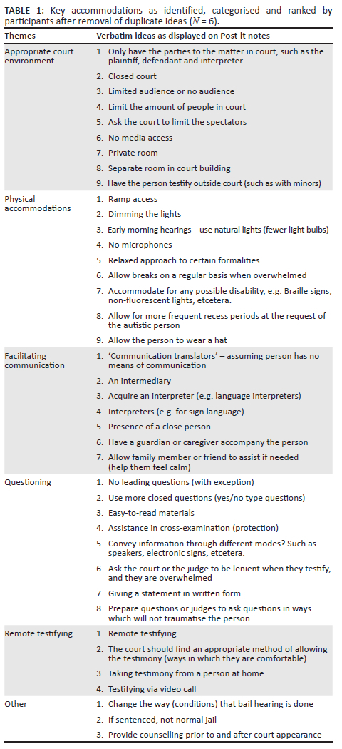 The data obtained through the NGT provided a wealth of information about potential accommodations that could be used in court for persons with communication disabilities. This showed that students were aware of the possible accommodations that could be offered. Initially, they grouped their ideas related to accommodations into six categories (see Table 1), namely (1) Appropriate court environment, (2) Physical accommodations, (3) Facilitating communication, (4) Questioning, (5) Remote testifying and (6) Other. The first category generated the most ideas and included the theme of ensuring an appropriate court environment. Here participants included accommodations such as holding proceedings in closed court and prohibiting media access to the courtroom. The former accommodation was featured five times, while the latter was featured only once. They also discussed aspects such as limiting the number of people present in court to only the parties who are directly involved and limiting spectator access. Furthermore, they suggested holding court in a private or separate room in the court or that the person could testify outside of court - such as the accommodation that exists for children.