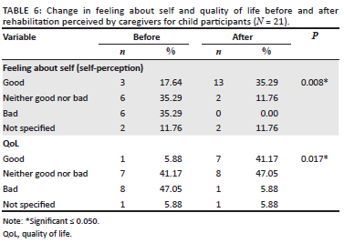 The study also reflected the perceptions of the users to realistically evaluate the outcomes of rehabilitation interventions. When the perceptions of service users are probed, it is important to consider a person-centred approach that is user-friendly and not influenced by power-dynamics. Tailoring assessment tools to the specific population being assessed is crucial to obtain accurate and relevant information (Dronavalli & Thompson 2015). In this study, simple scales and structured interviews allowed participants to express their views on changes in activities and participation and considered caregivers' feelings and QoL in relation to caring for their child and the impact of rehabilitation on them (Irwin et al. 2012).