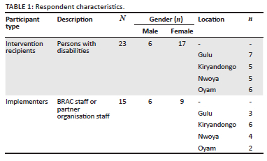 Of the intervention recipients interviewed, 14 had varying forms of physical disabilities, 6 had visual impairments and 3 had hearing impairments. For hearing impaired participants, interviews were carried out by research assistants who were proficient in Uganda Sign Language (USL) who recorded and later translated the data into English for analysis. Information sheets were read aloud to participants who had visual disabilities or who were illiterate. In addition, the intervention recipients who could not speak and understand English were interviewed in Luganda and Luo, and the data translated and transcribed in English for analysis.