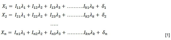where X1, X2 and Xn are known variables, õy is the jth factor, and Ay is a constant representing the ith and jth factor (δ represents uncertainty).