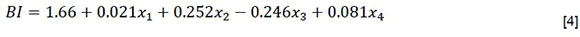 Standardised coefficients, representing how many standard deviations of dependent variables will change per standard deviation increase/decrease in the predictor variable, was therefore desired. Standardised regression coefficients obtained from the multiple regression procedures standardised to ensure that the variances between the dependent (identified variables) and the independent (BI) variables is one, are shown in Table 3. The data in Table 3 show that the unstandardised coefficients indicate that the dataset has p-values greater than 0.05 (statistical significance) and therefore does not provide a good fit for the data. Therefore, it was necessary to do data fitting using least squares estimation as shown in Equation [4] below: