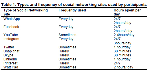 The participants were asked how frequently they used these social networking sites. Table 1 shows the participants' responses. For example, one participant indicated;