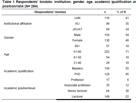 A representative sample of academics employed at the selected universities was obtained through stratified random sampling whereby the population was divided into strata based on the academic positions of the respondents from the different universities. Each sample was selected in proportion to the size of the population of each stratum, thus the bigger the population of the stratum, the bigger the sample (Schutt 2009). A sample of 341 comprised 167 academic staff from the UoN, 73 from the JKUAT and 101 from KU.