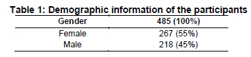 The participants' demographic data showed that all 485 (100%) of the students participated in the response during the class hours. Many of the students were first-year students (60%) and second-year students (40%). Their age range was also checked, and it was indicated that more students were in the age range of 19-21 (45%), followed by 22-24 (35%) and 16-18 (15), and the least were those in the range of 25 and above (5%).