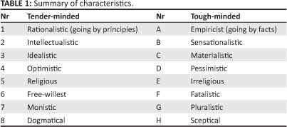 In his famous series of lectures delivered in 1907 in Boston and New York, published under the title, Pragmatism: a new name for some old ways of thinking, James distinguished two temperaments in philosophy: the tender-minded and the tough-minded (James 1913:12). He summarised the characteristics of the two temperaments in a table (see Table 1).