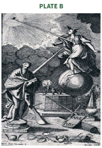 Voltaire, prime mover against superstition, in Plate A establishes Newton himself as a 'divinity'. Newton is located in heaven measuring the universe, with one of the Muses, symbol of inspiration or illumination, in this case in feminine subjection (but in control of her status), projecting the light from Newton to Voltaire. The latter works at his desk with a mere earthly globe near him. The Muse, (in fact his mistress), here replaces Vico's 'Maiden Metaphysical Theology'. In a still very male dominated context, that of natural science, Voltaire at least recognised the major contribution made by the woman in his life. Pre-Christian mythology provided him with support: the Muses were female, all nine of them, giving and revealing intellectual culture to humankind. In Plate C the traditional erotic context is quite up front; so also in the Voltaire frontispiece. This has Ancient roots: Aeschylus lets the 'humane' god, Prometheus, claim invention of intellectual literacy, revealed via the Muses: