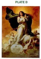 Plate D Immaculate Conception (1678), E Immaculate Conception (1655), F St Bernard and the Virgin (1655), by Murillo. In the 1655 and 1678 paintings Mary had just received the message that she was expecting the Saviour, and she conserved the message in her heart. Her face is one of wonder; she apparently stands on the moon and a cloud and is supported by baby-like angels. The angels are in amazement and adoration. St Bernard is seen in adoration of Mary in Plate G. She has baby Jesus in her left arm, and has an open breast so as to feed the baby, but is looking at the Saint. St Bernard is pointing to the Scriptures: 'so that the Scriptures may be fulfilled...' The central spaces of the paintings are illumined, but the source of light is hidden. The atmosphere is one of wonder, silence, humility, adoration and upliftment (cf. further Garin, 1995:32-34).