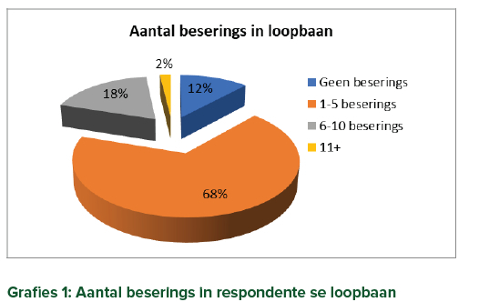 Met die ondersoek is ook gepoog om vas te stel of leerders in die Meganiese werkwinkels beseer word (Grafies 1). Die meeste van die respondente (68.13%) het aangetoon dat daar tussen 1-5 beserings oor die tyd van hulle onderwysloopbane plaasgevind het. 18.13% van die respondente het gemeld dat daar 6-10 beserings plaasgevind het, terwyl slegs 1.88% respondente aangetoon het dat daar 11 + beserings was. 11.88% van die respondente toon aan dat daar geen beserings ooit in hulle werkswinkels was nie.