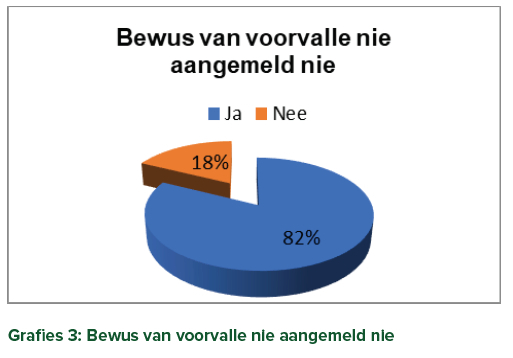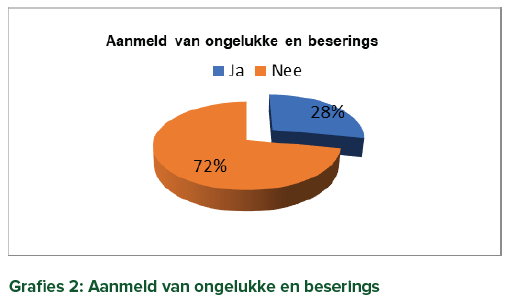 Heelwat van die respondente het vrees vir regsimplikasies en vir dissiplinêre optredes voorgehou as rede om nie die voorvalle aan te meld nie, wat 'n aanduiding is dat hulle nie genoegsame kennis of inligting rakende konsekwensies van ongelukke of beserings het nie.