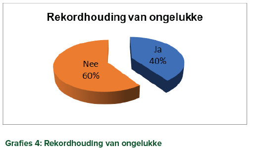 'n Verdere aspek wat kommer wek is die rekordhouding van ongelukke in die skoolwerkswinkels. Slegs 40.25% van die respondente het aangetoon dat 'n noukeurige rekord van werkswinkelongelukke gehou word (grafies 4).
