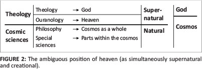 But, instead of consistently following his chosen principle of division, Stoker (1961:241; 1971:38) decided to place ouranology within the ambit of theology. Stoker (1961:241) was well aware of this inconsistency, stating that 'it may be inconsistent, but in accordance with tradition (...) we assign ouranology as an additional task to theology'. Tradition here outweighed consistency. Can this be a remnant of the nature-super-nature theme, in which the world of the angels is regarded as being supernatural? Figure 2 indicates the ambiguous position of heaven when cast in the nature-super-nature mould.
