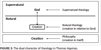 In contrast to philosophers, theologians are only interested in creation so as to 'ascend' from it to knowledge of God. Theology's ultimate aim is thus knowledge of God and not knowledge of creation as such. As stated by Thomas Aquinas (1955, SCG 2.4.5), natural theology 'considers creatures only in their relation to God'; philosophy 'considers creatures in themselves' (see Figure 3).