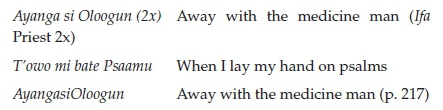A song similar to the one just mentioned calls for the use of the psalms incantations against evil (cf. Oshitelu n.d.:14):