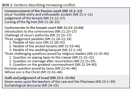 Once the place of the woes and eschatological discourse (Mt 23-25) is defined in relation to the other discourses in this Gospel, the increasing confrontation during the first four days of the Passion week in Matthew 21-22 is argued. It is demonstrated how this confrontation commences with Jesus' humble, yet royal, entry into Jerusalem, that is followed by the judgement of the temple and the fig tree. This action of Jesus exposes the opposing attitude of the Jewish leaders and entices their anger. This leads towards controversy dialogues (Streitgespräche) between these leaders and Jesus in the temple court. This controversy dialogue climaxes with Jesus' severe response to the teachers of the Law and the Pharisees.