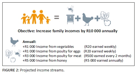 The researcher's aim was to double the annual family income from ±R10 000 earned from social grants to ±R20 000 by earning an additional ±R10 000 income from other income generating activities. As can be seen in Figure 2, income needed to be spread out throughout the year and diversified to mitigate cashflow and climate change obstacles. As can be seen by the zero production of honey achieved in 2016 (Figure 1), it is not viable to present beekeeping on its own as a poverty alleviation activity. The researcher therefore introduced other income generating activities to compliment the beekeeping and help break the nutrition poverty cycle. The activities included egg, meat, vegetable and fruit production using climate mitigation methodologies.