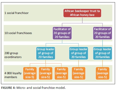 Micro-franchising is a business model that applies elements and concepts of traditional franchising to small businesses in the developing world (Lehr 2012). It refers to the systemisation and replication of micro-enterprises. Micro-franchising is broadly defined as small businesses that can easily be replicated by following proven marketing and operational concepts (Fairbourne, Gibson & Dyer 2007). AHB used this model to offer its members business-in-a-box (honey, vegetables, eggs, meat and fruit production) solutions for generating income.
